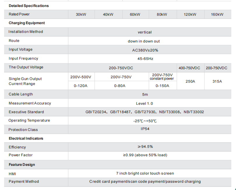 1) ಚಾರ್ಜರ್ ಸ್ಟೇಷನ್ ವಿದ್ಯುತ್ ಶ್ರೇಣಿ: 30 ಕಿ.ವ್ಯಾ ~ 160 ಕಿ.ವ್ಯಾ.
